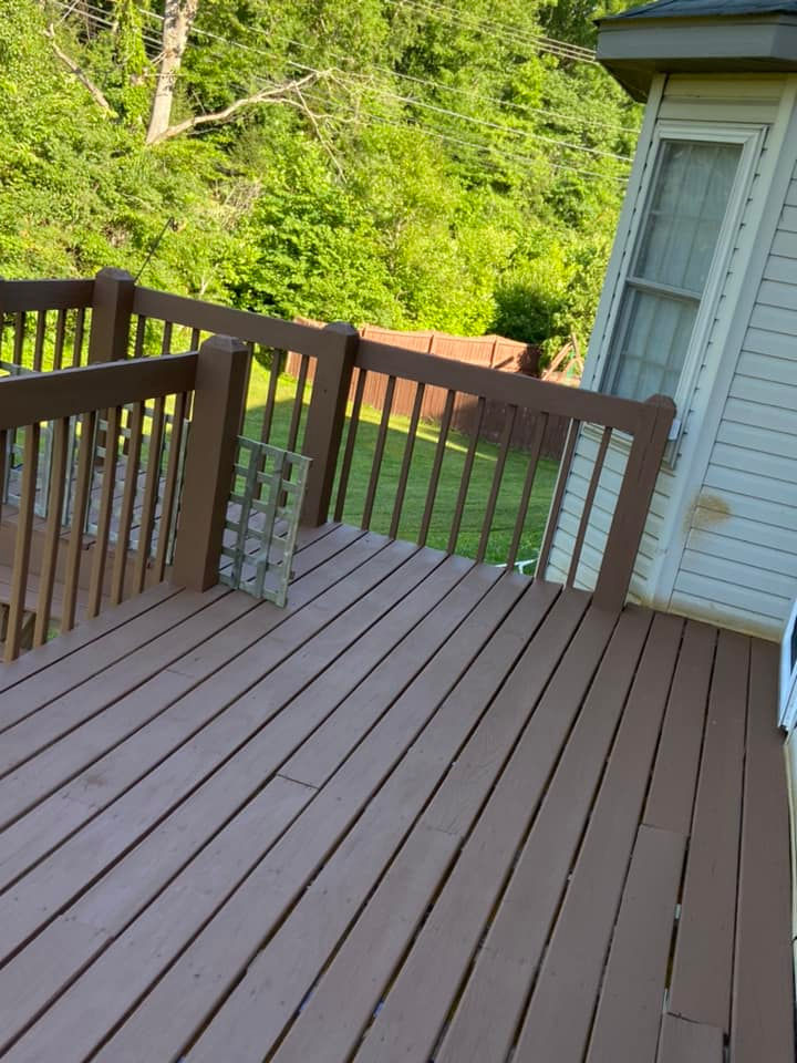 A compilation of deck and patio designs, including wooden deck with white metal railing, wooden deck with stairs and metal canopy, and wooden deck attached to a house, surrounded by greenery.